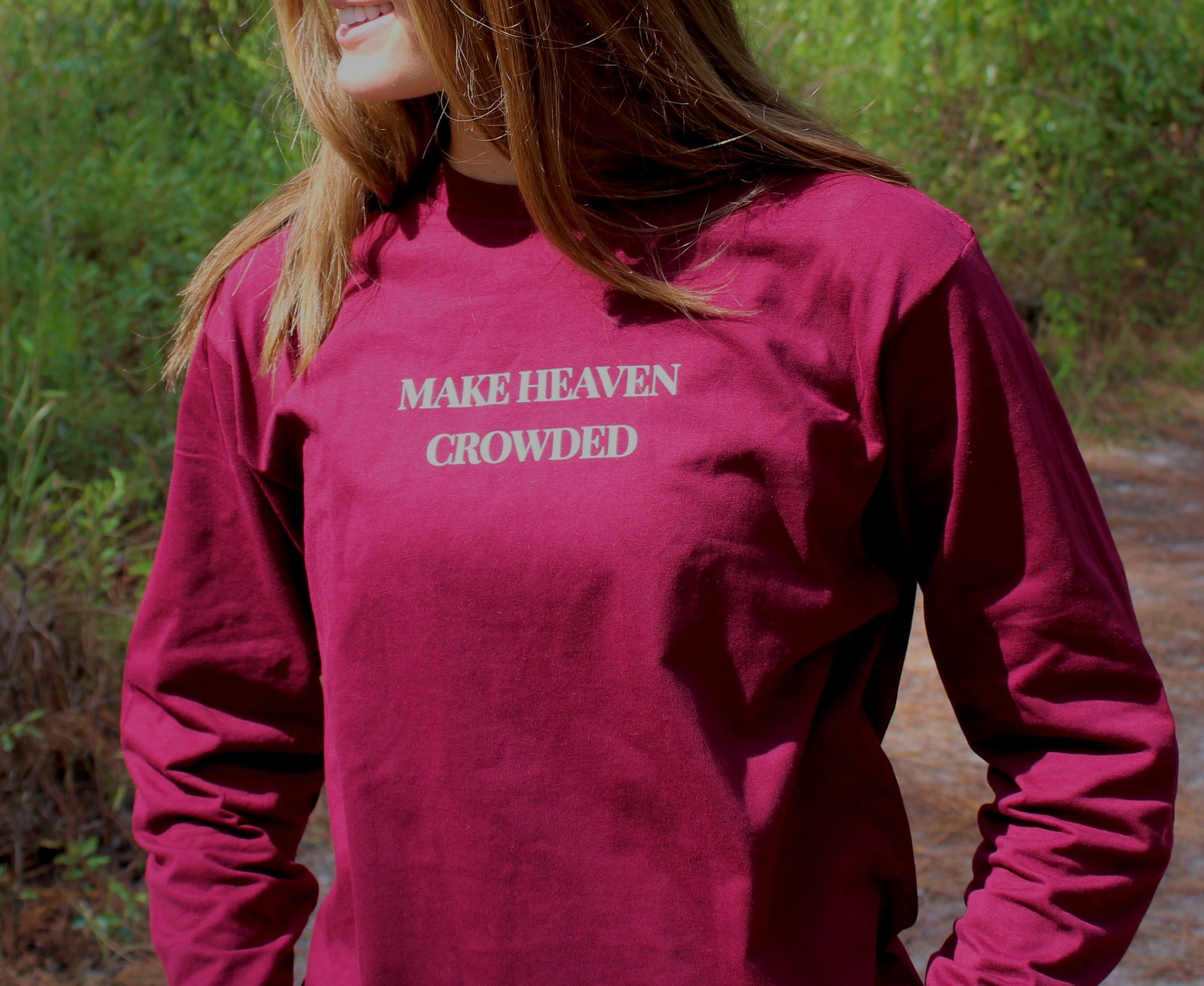 Part of our Faith through Fall Collection, this unisex long sleeve tee brings cozy fall vibes with a bold reminder to Make Heaven Crowded. Designed in a rich maroon red with crisp white lettering across the chest and a custom label stitched on the side, it’s a versatile staple for cooler weather.